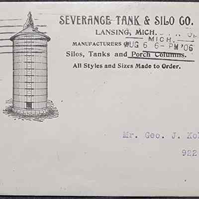 Severance Tank Works, Manufacturers of Water Tanks, Silos, and Porch Columns. Postmarked and dated 1906.