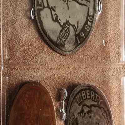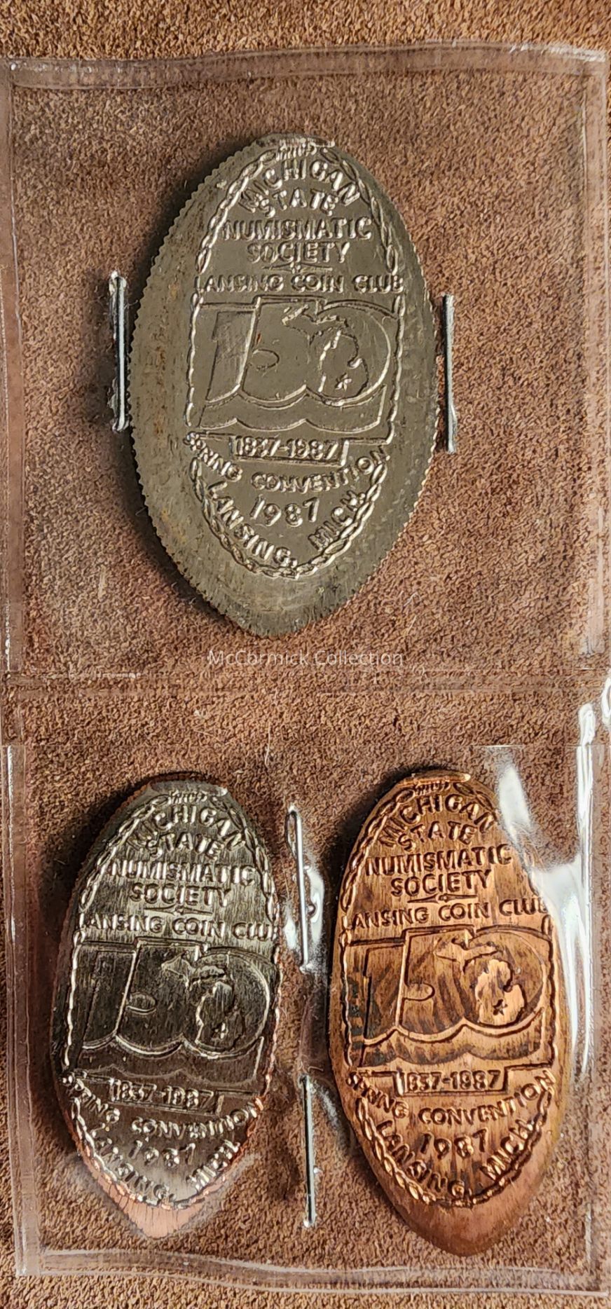 1987 Michigan Numismatic Society and Lansing Coin Club elongate from Michigan Sesquicentennial 150th anniversary birthday, from the society's Spring Convention. Designed by Craig A. Whitford.