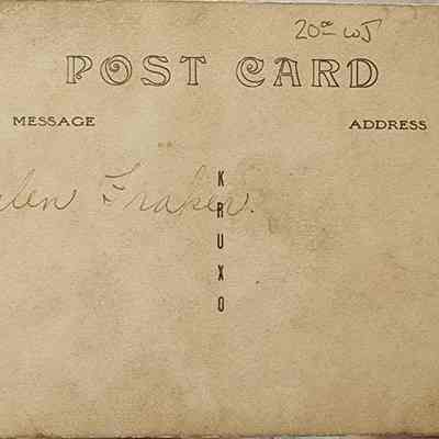 Real photo postcard of Helen Fraker on a paper moon backdrop by Lansing photographer Lansing Studio.