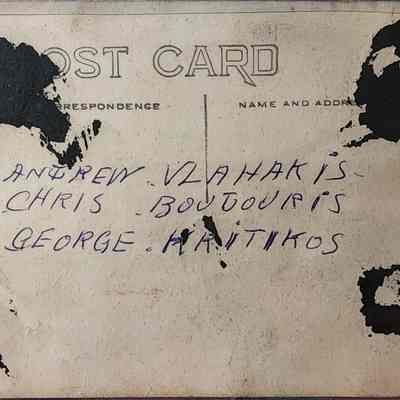 Real photo postcard of three men from the Boston Cafe in Lansing. Ancestral restaurant to Jim's Tiffany. Pictured, left to right are: Andrew Vlahakis, Chris Boutouris (sp), and George Kritikos (sp). Postally unused. Removed from an album.