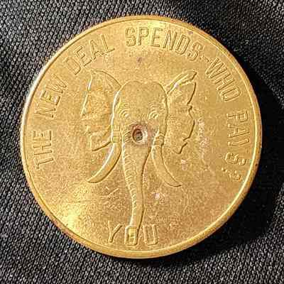 Token reading "Don't be an Ass Vote Republican / The New Deal Spends - Who Pays? You." Features elephant and donkey symbols. From the Nancy Waters Collection.
