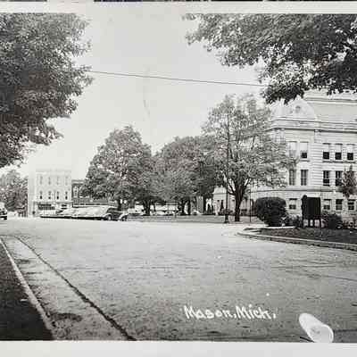 Real photo postcard of courthouse square and downtown, Mason, Michigan. A 1950 Lansing postmark. Subject: Court, Courthouse, Court House