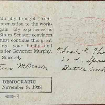 A 1938 political campaign postcard for Frank Murphy for Governor. Sent by Sen. Prentiss Brown supporting Murphy.