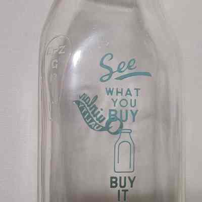 A square quart bottle with green pyro for Quinlan Bros. dairy of Williamston, Michigan. With "See what you buy / Buy it in glass" slogan.