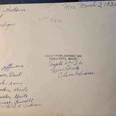 Holt High School sophomore class, 1929-1930. Mrs. Bixby, class advisor. Dated Monday, March 3, 1930, 12:47. Class officers listed: Paul Jackson, president; Amos Wrook, vice president; Guile Guenther, secretary and treasurer; athletic board: Russell Jessop; news reporter: illegible. The name Charles E. Rathbun, Box 147, Holt, Michigan, is written on the back with the other identifying information. The name C. Parker is written on the back. Stamped on the back is "Camp Publishing Co., Ypsilanti, Mich."