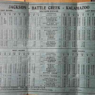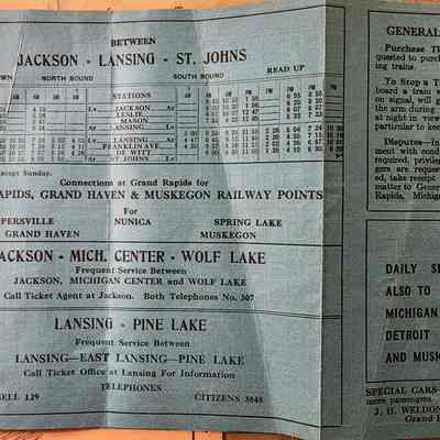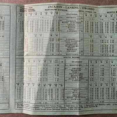 A timetable for the Michigan United Railways Company, or interurban, for the Lansing area in 1923. Attached to a single scrapbook page.