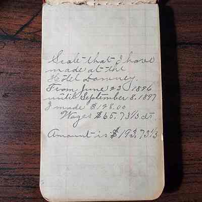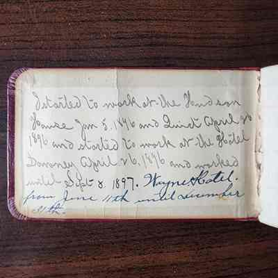 Small red leather bound notebook, possibly belonging to Henry Siebert, which mentions the Hudson House, Hotel Downey, and Wayne Hotel. Circa 1890s. From Siebert Estate.