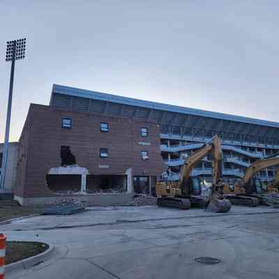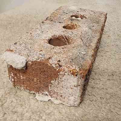 A brick salvaged from the demolition of Michigan State University's Central Services building on August 8, 2025. Built in 1948, Central Services was originally the home of campus-wide food preparation, but eventually became, in part, home to the collections of the MSU Museum.