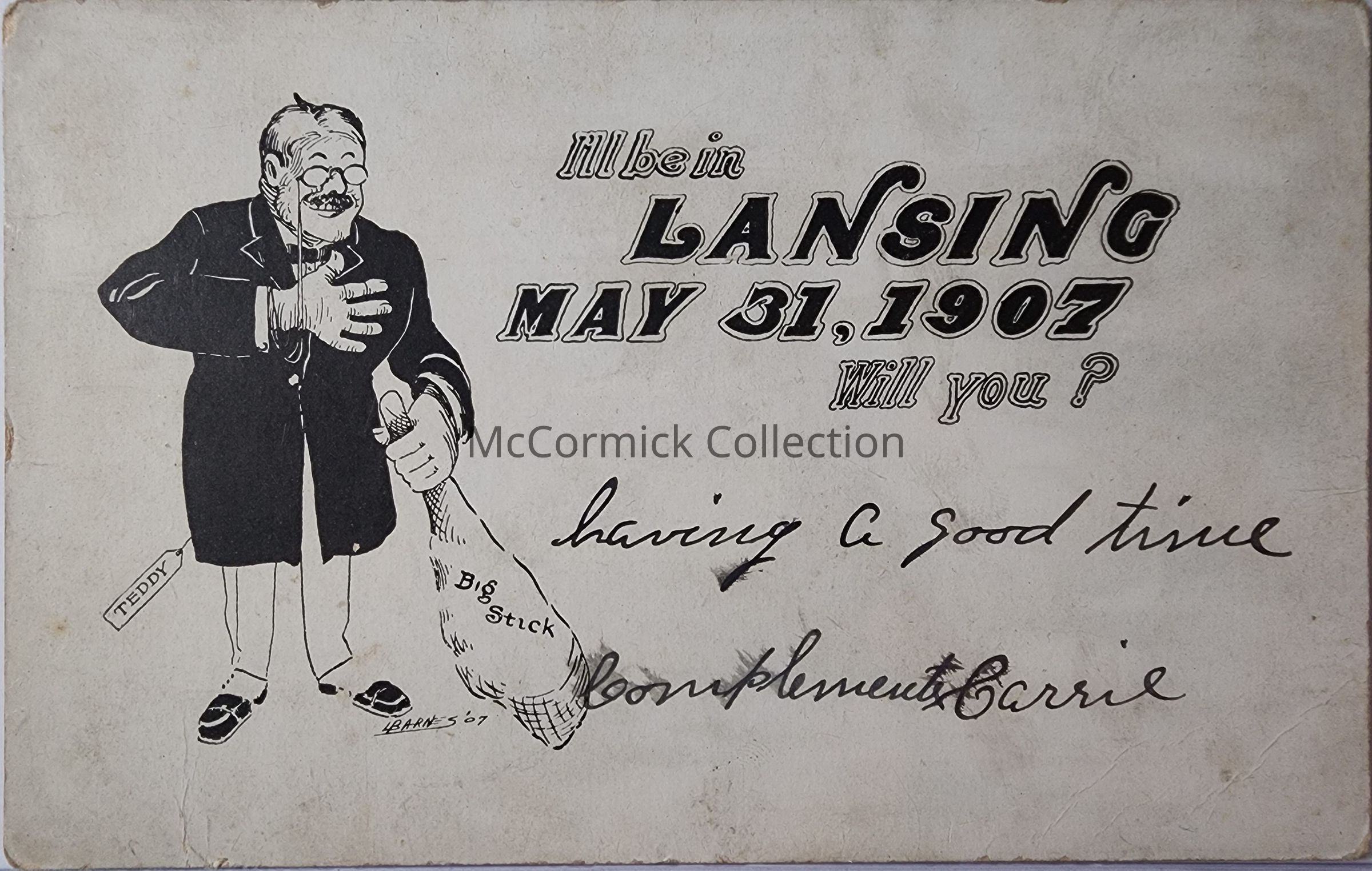"I'll be in Lansing / May 31, 1907 / will you?" Featuring an image of Theodore Roosevelt. Teddy visited Lansing in 1907 for the Semi-Centennial of Michigan Agricultural College. Addressed to Flint, postmarked 1907. Postally used.