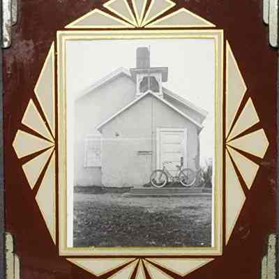Snapshot photograph of the Lott School in Delhi Township (Holt) in 1937. Photo in an art deco frame.