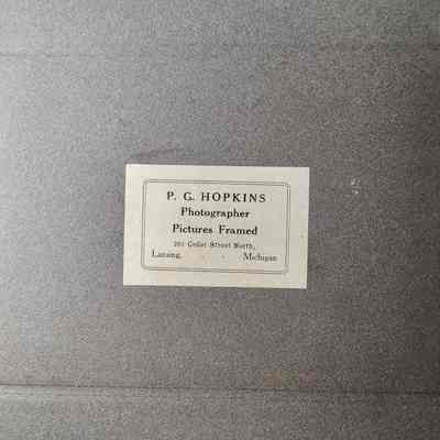 Card mounted photograph of a house in the woods with a group of people gathered outside. American flags are hanging by the house. Photo by little known Lansing photographer P.G. Hopkins, 201 N. Cedar St., Lansing.