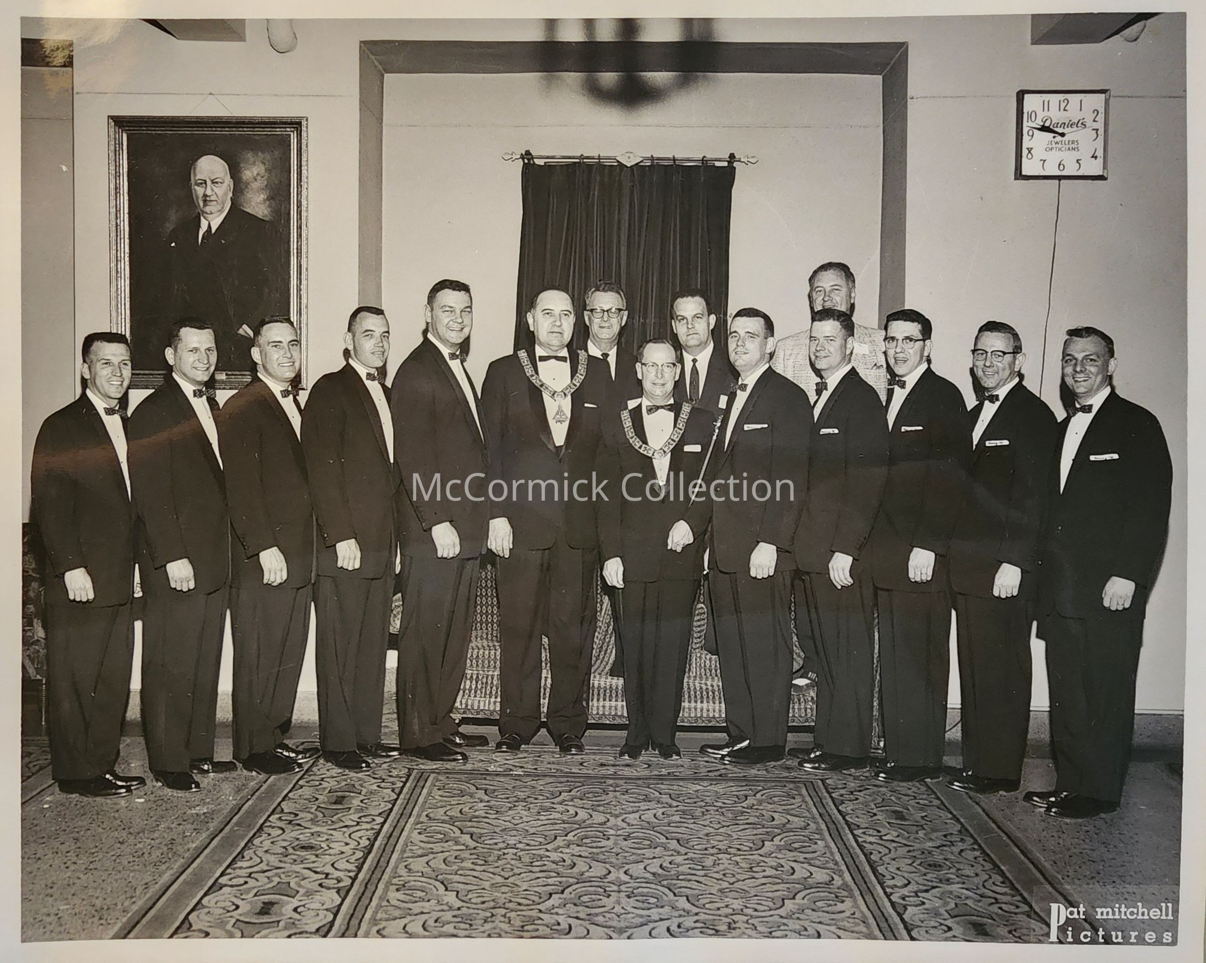 Photographic print of a group of Elks including Willard Nelson, exalted ruler, at center with mace. Photo by Lansing photographer Pat Mitchell.