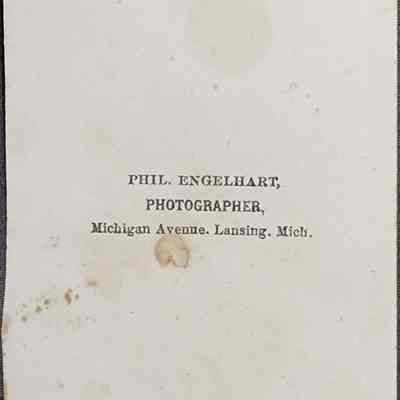 Carte de visite photograph of an unidentified man with an elaborate backdrop and props taken by Lansing photographer Philip Engelhart. The number 29 is written on a prop.