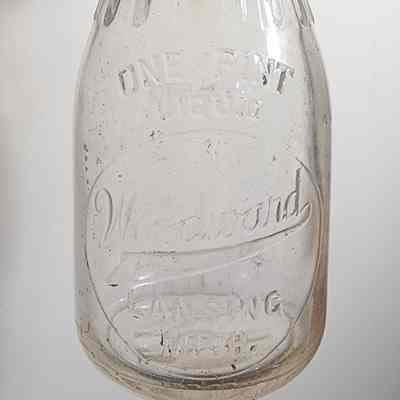 Pint bottle from the Woodward Sanitary Dairy of Lansing. Features a script logo on the slug plate and riged neck. In fine condition.