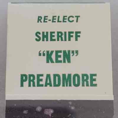 A box of new old stock green and white reelection campaign matchbooks (full) for Kenneth Preadmore for Ingham County Sheriff, circa 1970s. From the Preadmore Estate.