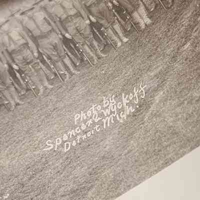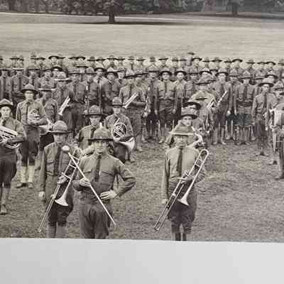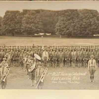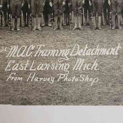 Panoramic photograph of the 2nd Michigan Agricultural College Training Detachment and Band in East Lansing, Michigan. Photo by Harvey Photo Shop in East Lansing, printed by Spencer and Wyckoff of Detroit.