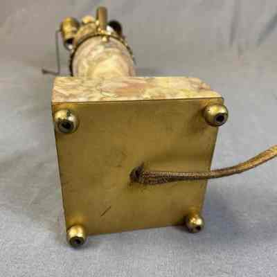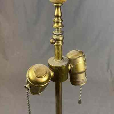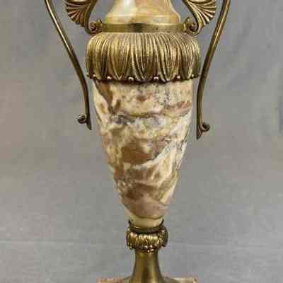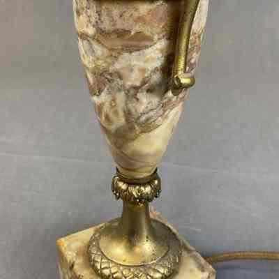 Marble table lamp with matching finial, 26" tall, with double sockets and pull chains. Circa 1920s stylistically. Said to be from R.E. Olds' Lansing mansion, acquired from the Smith Estate in Dimondale, direct descendants of Olds.