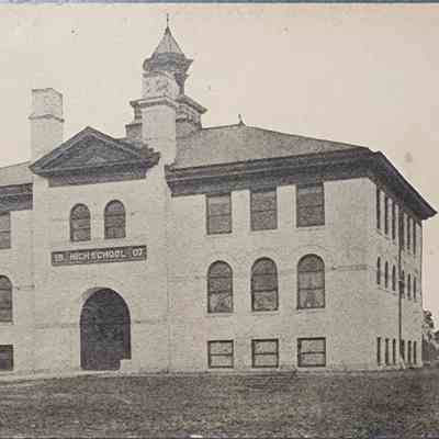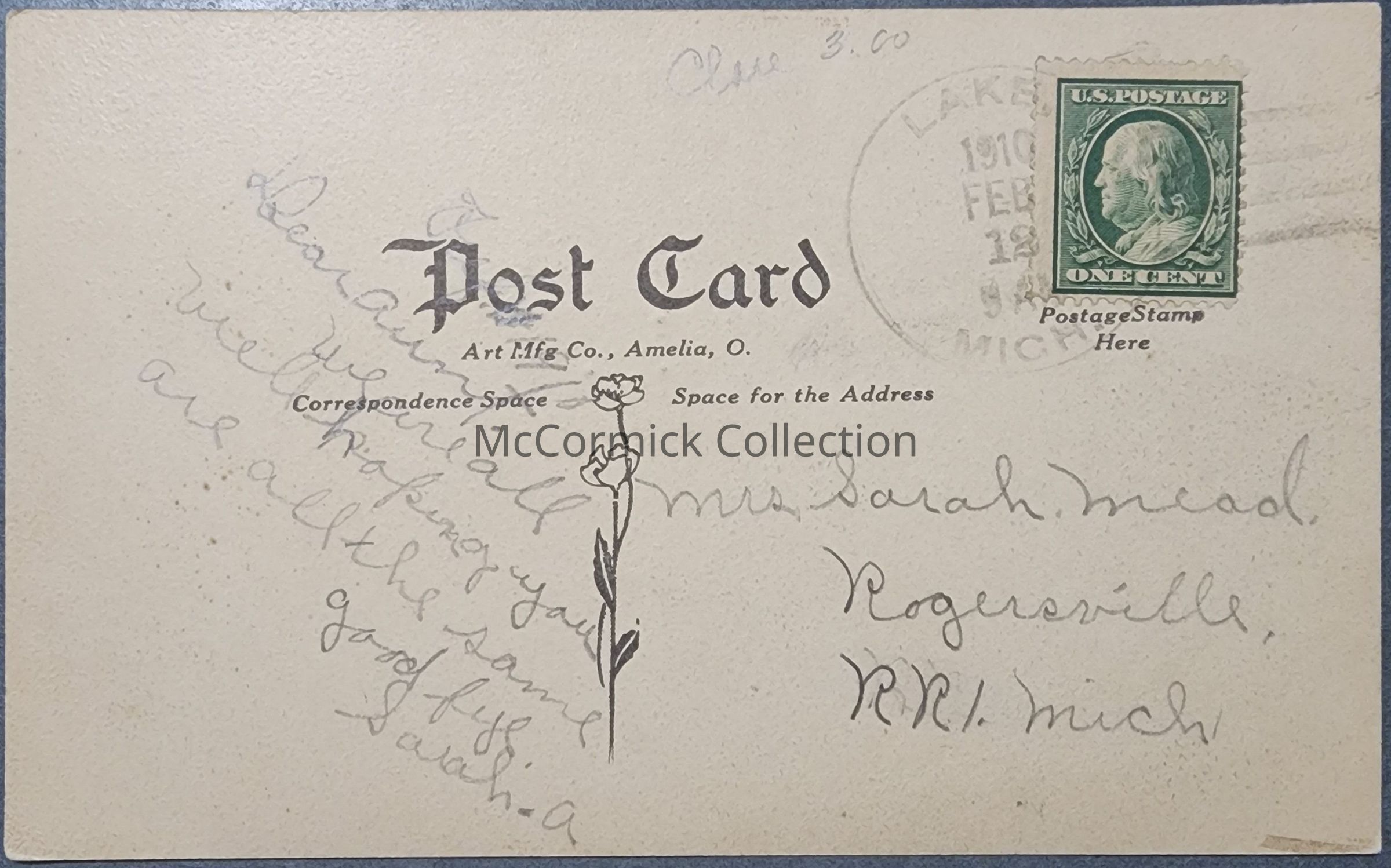 Postcard of Farwell High School with 1910 Lake, Mich. postmark.