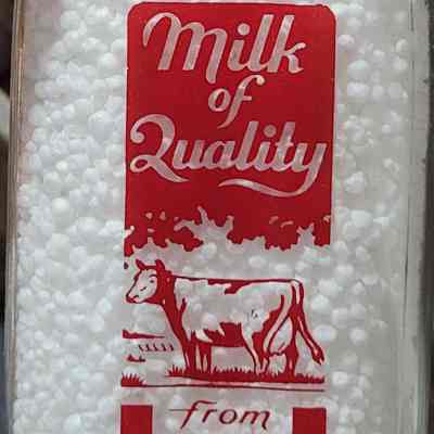 A square quart bottle with red pyro from the Kahres Dairy Farm of Holt and Lansing, Michigan, with back slogan of "Milk of Quality / from Farm to You."