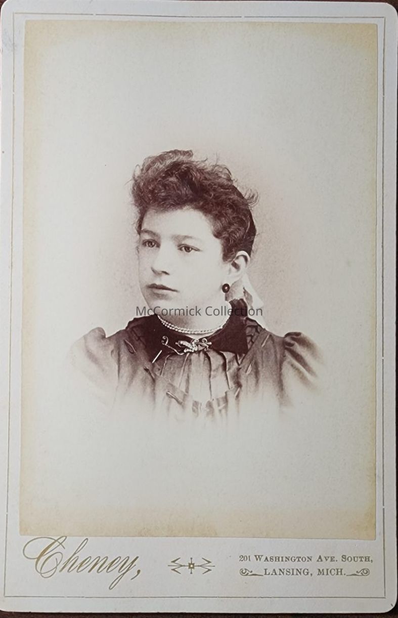 Cabinet card photograph of Katie M. Zimmer by Lansing photographer Cheney.