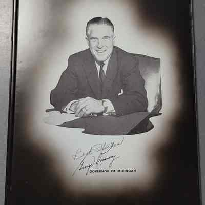 A black and white vinyl portfolio featuring George Romney on the cover with facsimile signature reading "Best Wishes George Romney Governor of Michigan." Circa 1960s.