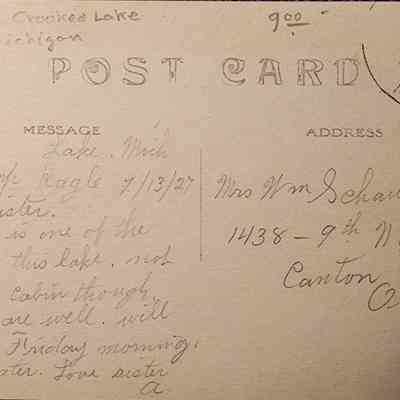 Cottage on Crooked Lake, Lake, Michigan. Postmarked 1927. Camp Hagle written on the message.