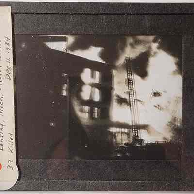 Glass slide of the December 11, 1934, Hotel Kerns fire on Lansing, Michigan. Slide labeled Boston, Mass.
