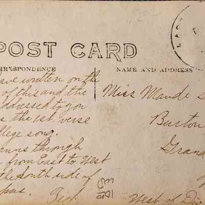 Portion of the Alma Mater: "Spreads thy campus alma mater, fairest ever seen" written on the front and explanation on back in message. Photo by East Lansing photographer C.E.W., Charles E. Walter.Made/Created