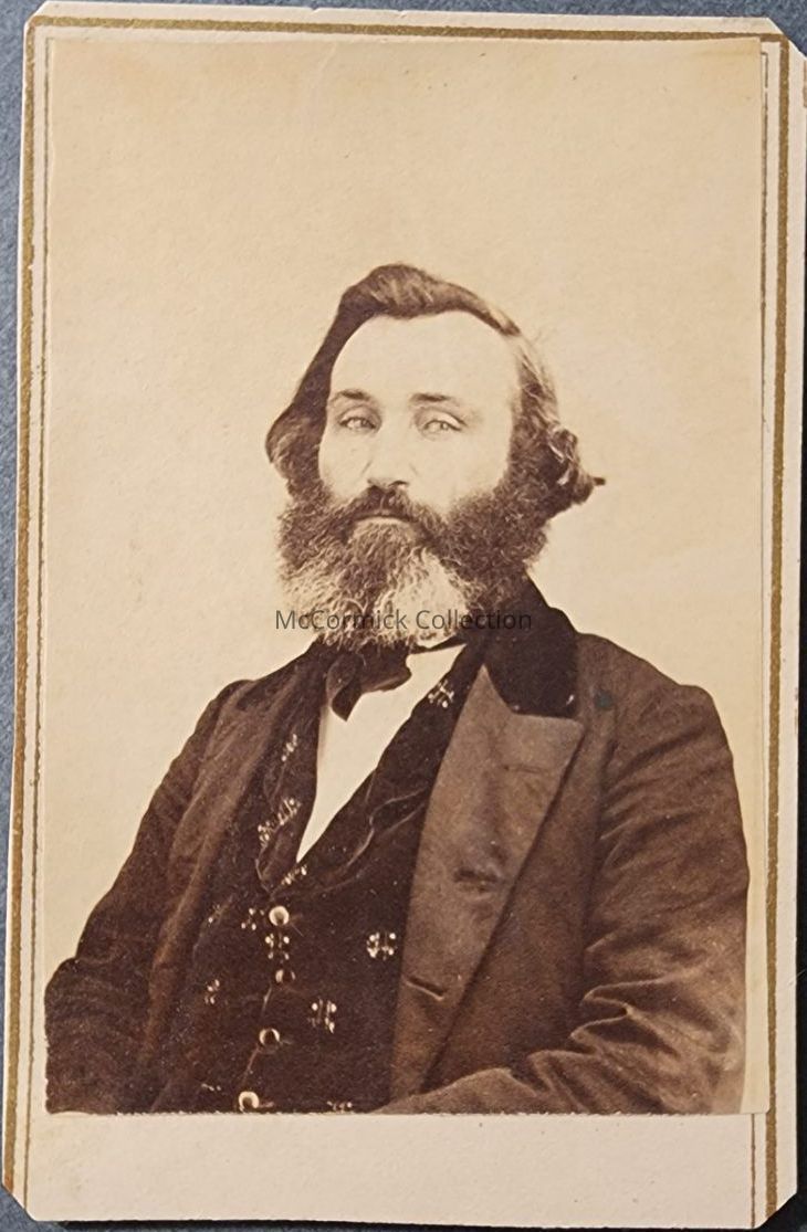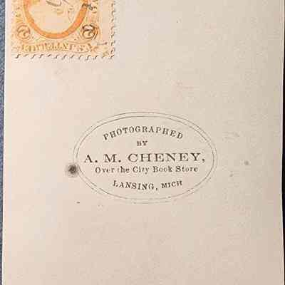 Carte de visite photograph of an unidentified man by Lansing photographer Cheney. Has orange 2-cent revenue stamp.
