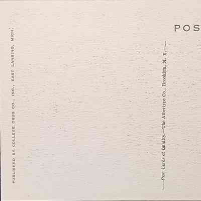 Postcard of the Abbot entrance to the campus of Michigan State in East Lansing, circa 1920s. Postally unused. Published by College Drug Co.