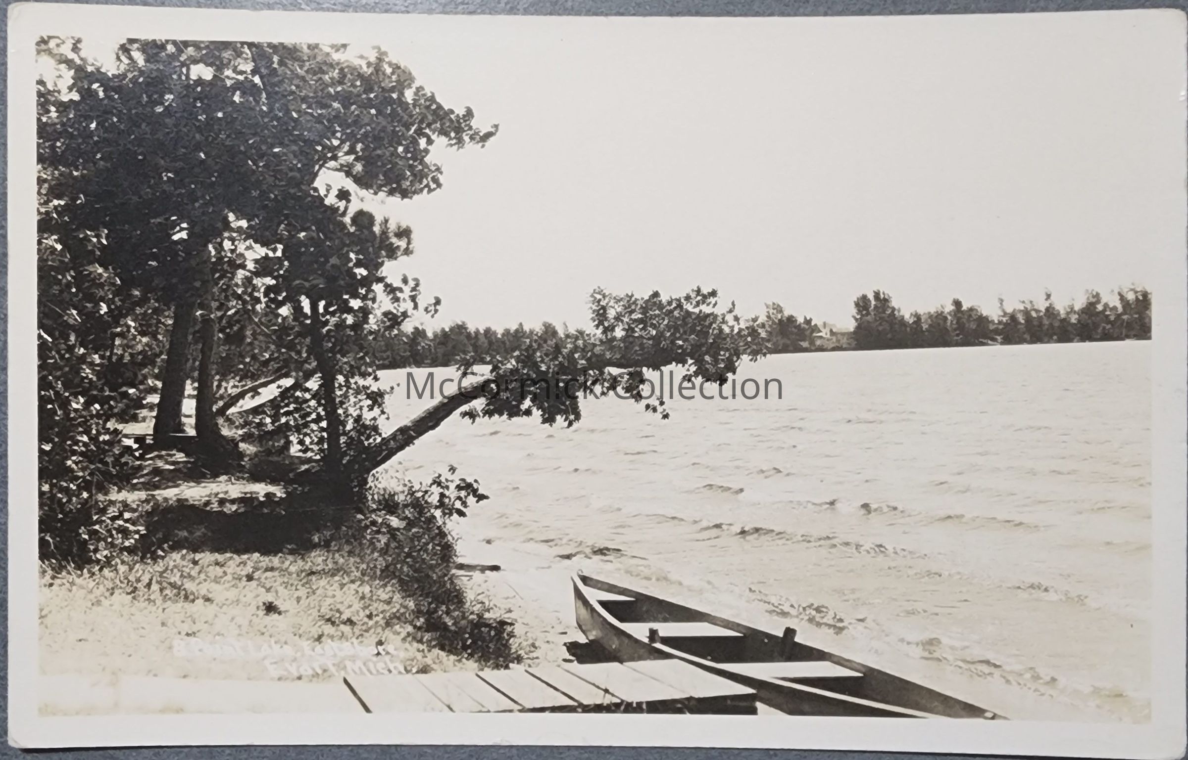 Real photo postcard of Eight Point Lake, east shore, in Lake, Michigan (mislabeled as Evart). Postally unused.