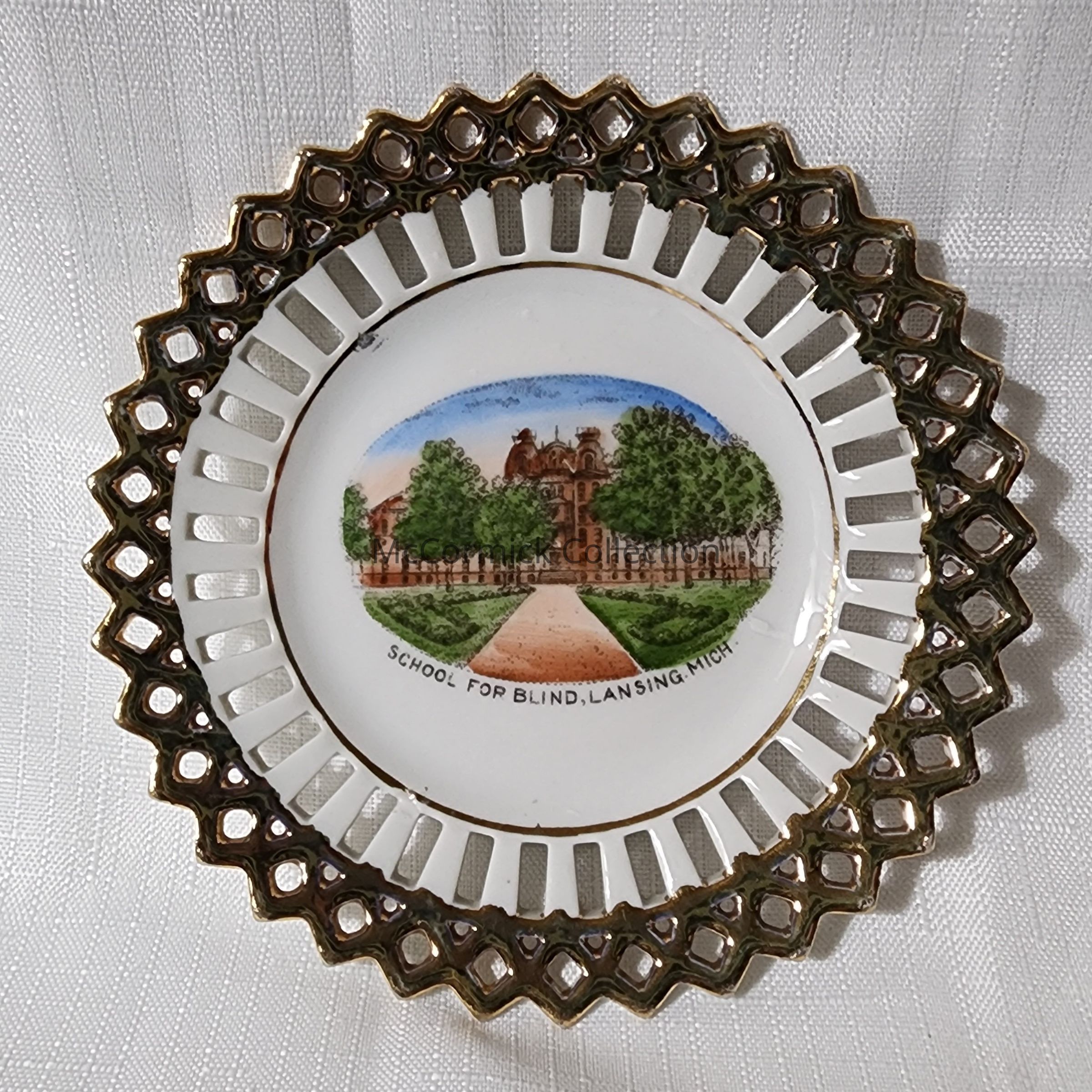Porcelain reticulated ribbon plate from the Michigan School for the Blind in Lansing.