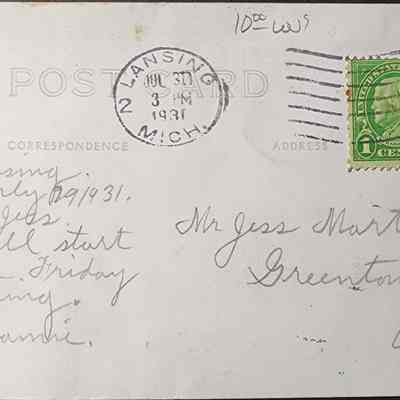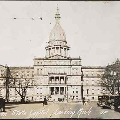 Real photo postcard of the Michigan State Capitol in Lansing. Negative number is A111. Postally used, 1931 Lansing postmark. Shows people and cars on Michigan Avenue.