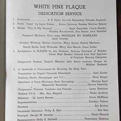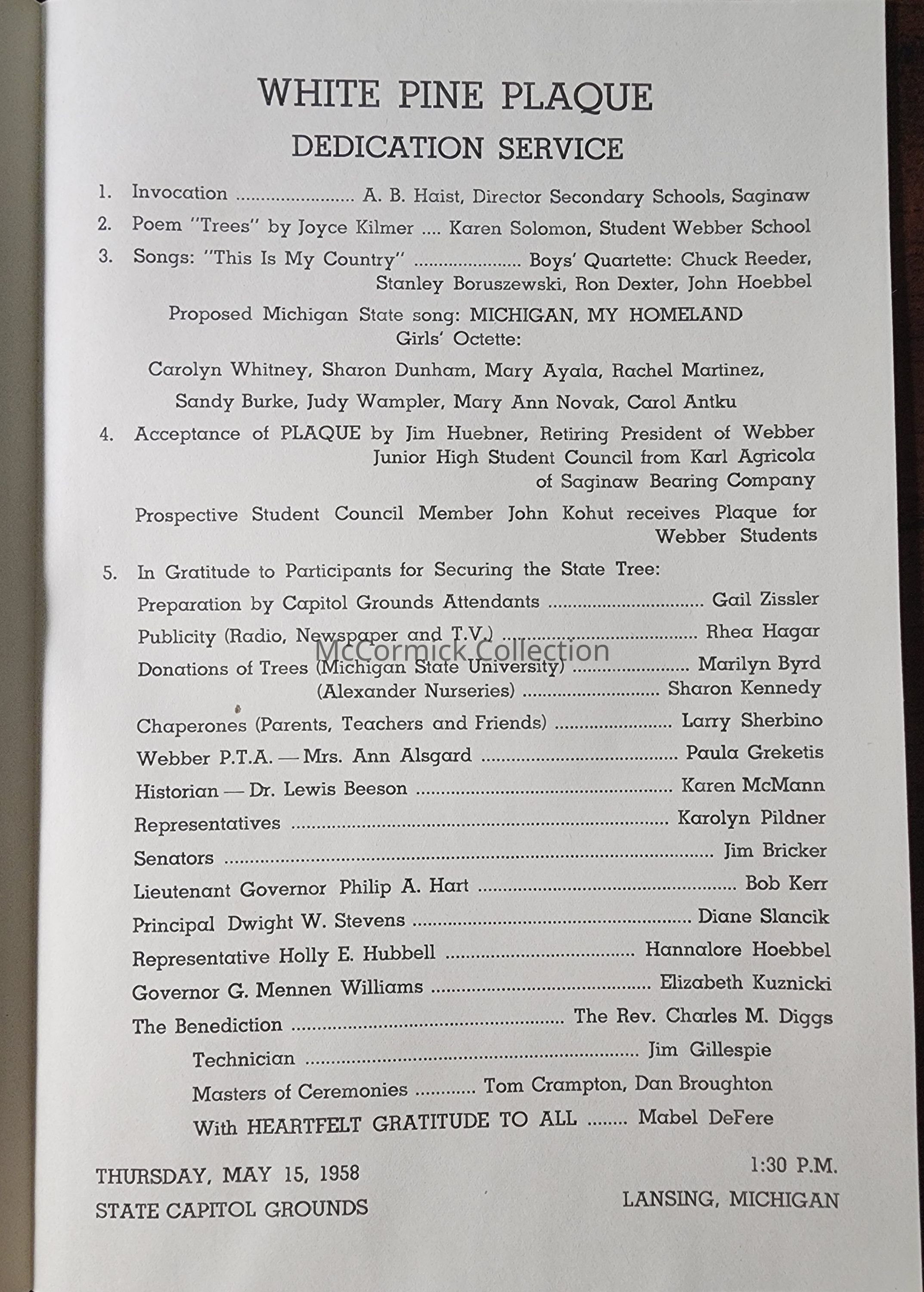 Program from the 1958 plaque dedication from the placement of a White Pine state tree plaque at the Michigan State Capitol. From Siebert Estate.