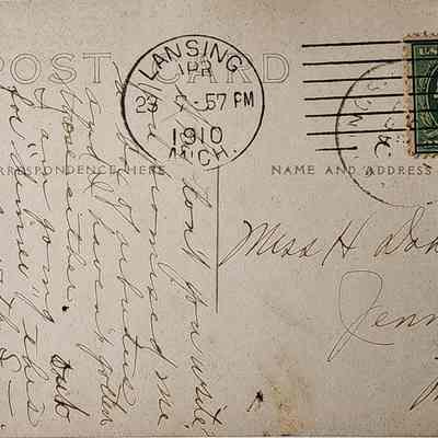 Real photo postcard of the Michigan Agricultural College Military Band marching on a street in East Lansing next to Interurban tracks. In the background is the photo studio of Charles E. Walter. Photo dated 1910, by CEW, Walter. Postally used.Made/Created