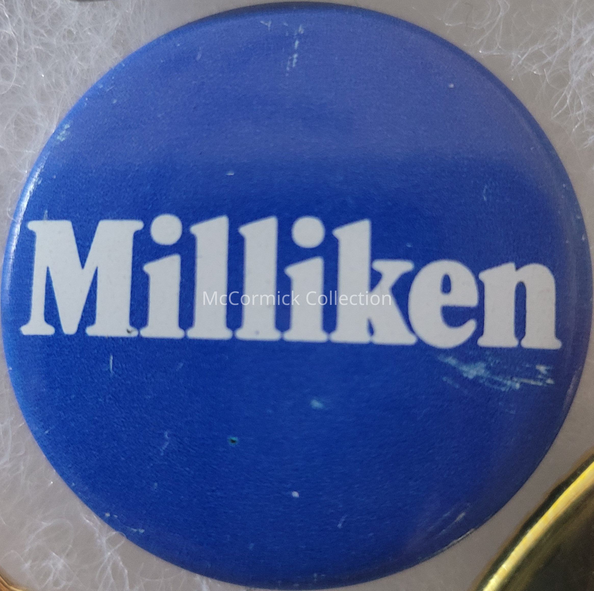 A 9/8" blue and white political button for William Milliken for Governor, circa 1970s.