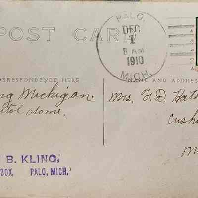Real photo postcard taken from the Capitol dome of a birds eye view of Downtown Lansing facing northeast. Shows Lansing City Hall, Post Office, and others. Postally used, 1910 Palo. Mich., postmark.