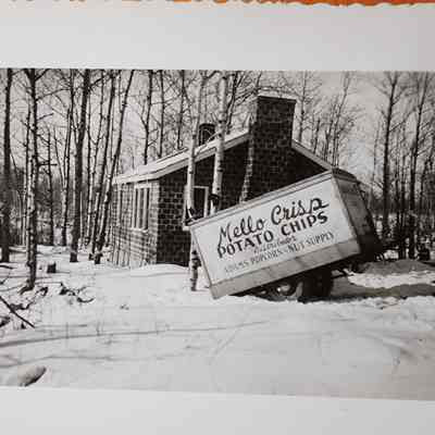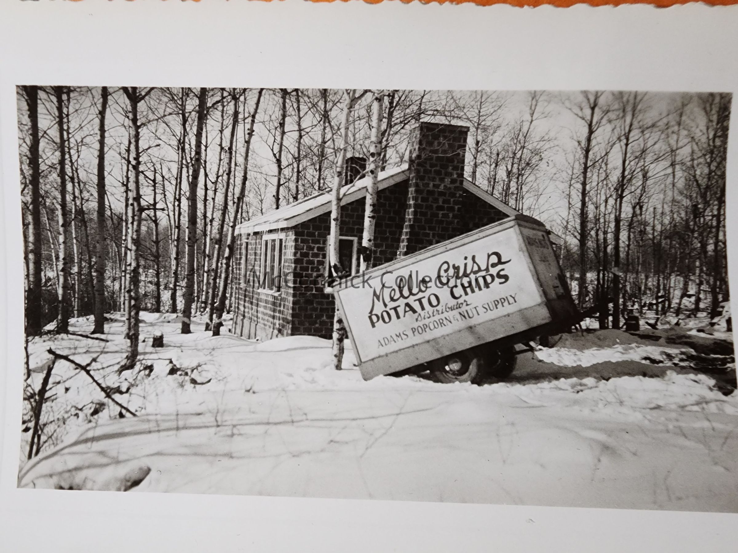 Orange Linprints folder of snapshots of a brick house cottage, possibly Houghton Lake, Michigan. Includes an Adams, Mello Crisp, advertising trailer.