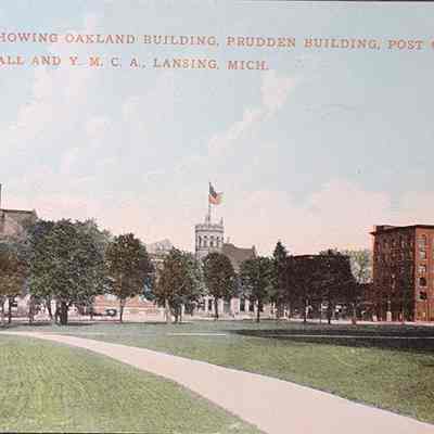 View Showing Oakland Building, Prudden Building, Post Office, City Hall, and Y.M.C.A., Lansing, Mich. Postcard