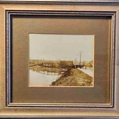 Framed photograph of the Kalamazoo Street Bridge during the Lansing flood of 1904. Shown in the photo are the Michigan State Capitol and other downtown advertising. Taken facing west after the Kalamazoo Bridge floated down river and stuck on the Michigan Avenue Bridge.