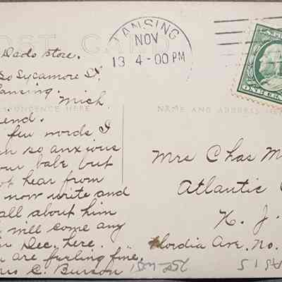 Real photo postcard of Washington Avenue in Lansing, showing a business district and the Welcome sign across the road. Photo by noted Michigan photographer Louis Pesha.