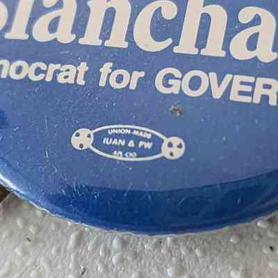 A 1.5" blue and white political button for James Blanchard for Governor of Michigan, 1980s. IUAN & FW AFL-CIO union bug.