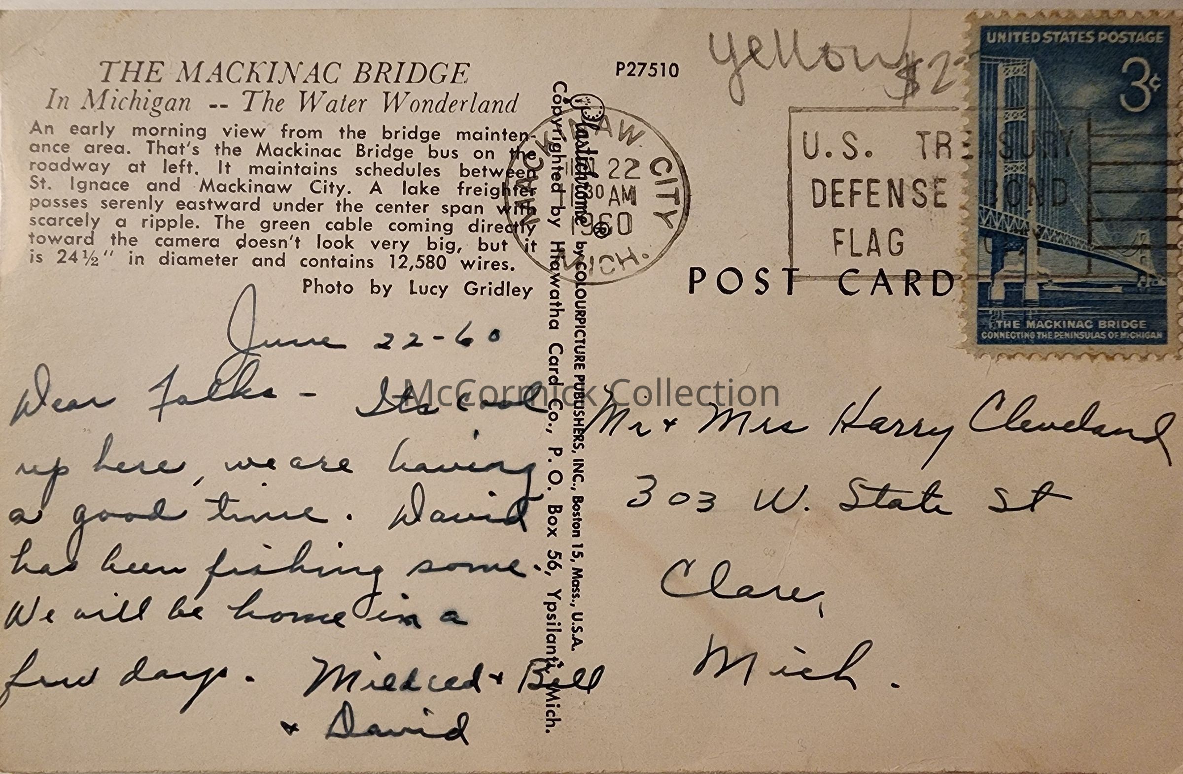 Postally used, Mackinaw City 1960 postmark.
