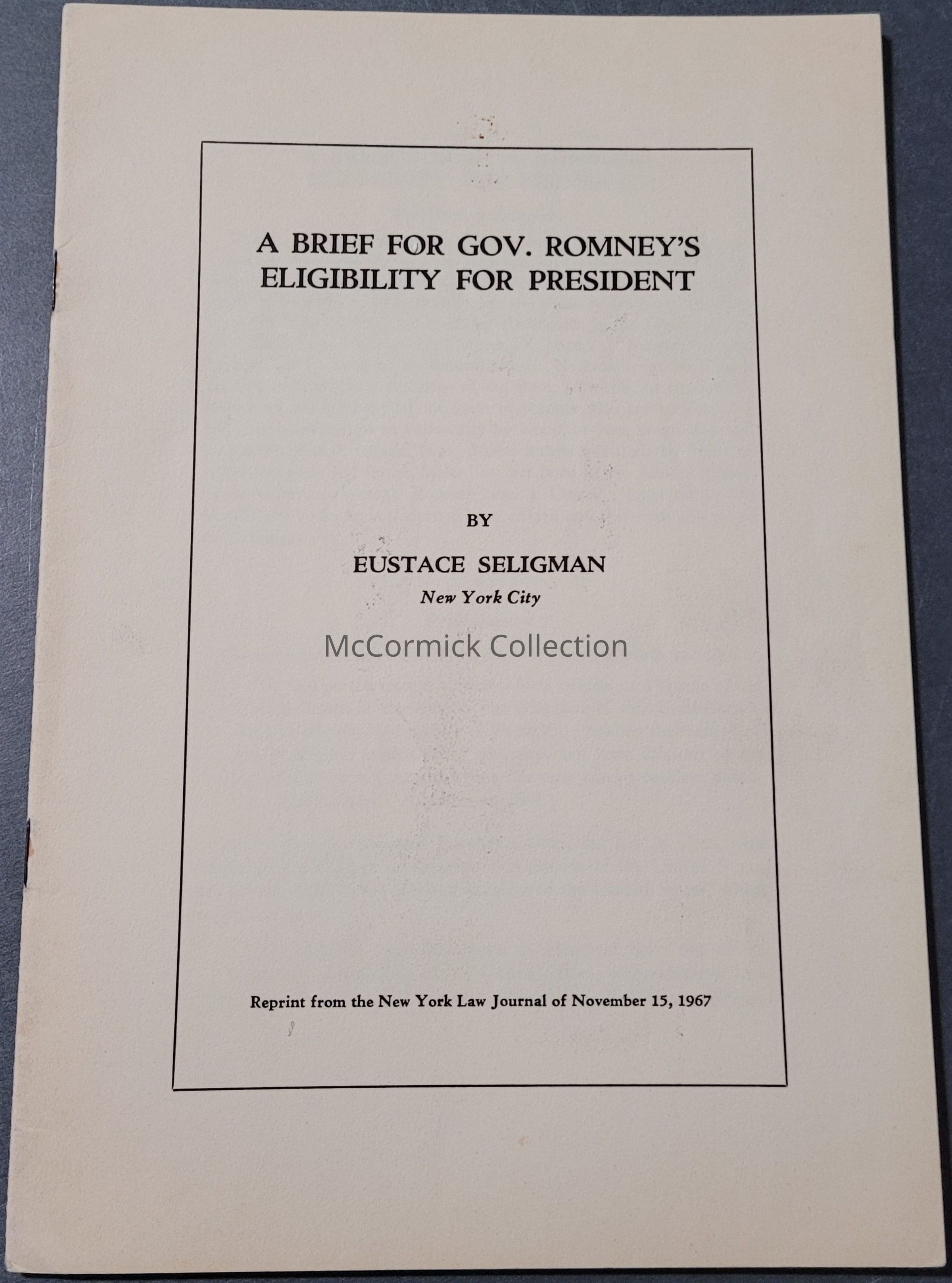Pamphlet on the eligibility of George Romney to run for president, 1967, by Eustace Seligman. From James Clifton.