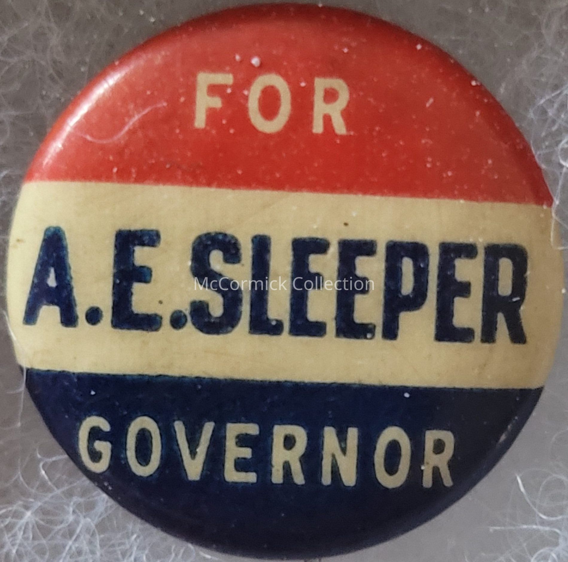 A 3/4" red, white, and blue political button for Albert E. Sleeper for Governor, circa 1910s.