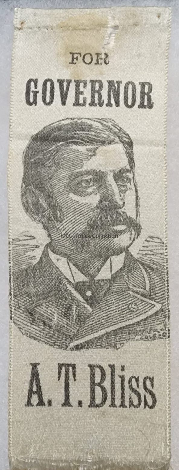 A 5.5" political ribbon for Aaron T. Bliss for Governor.