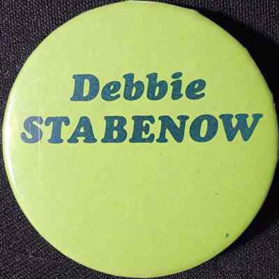 A 2.25" green and blue political button for Debbie Stabenow for State Representative, circa 1980s.