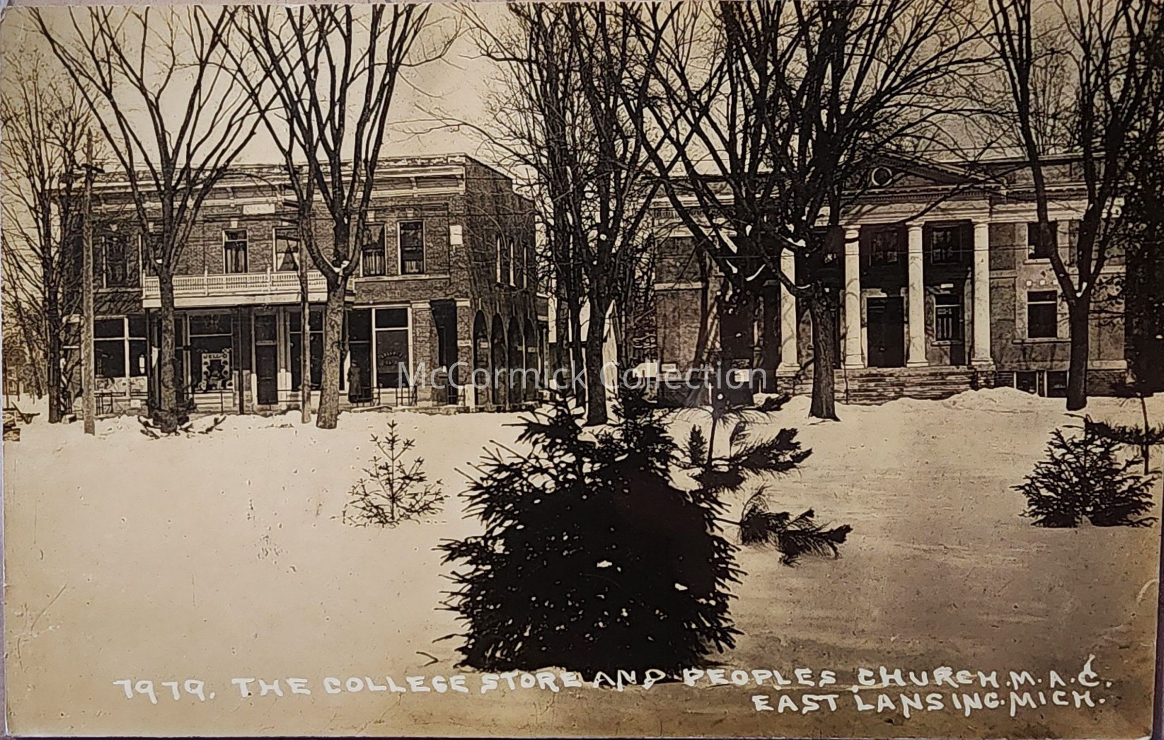 Real photo postcard of the College Store and Peoples Church in East Lansing.