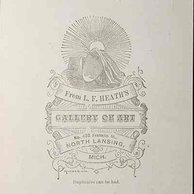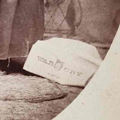 Cabinet card photograph of an unidentified woman by North Lansing photographer Heath. She is holding a book and tambourine. A paper titled "War Cry" is on the floor next to her. Circa .