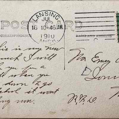 Real photo postcard of boaters on a river in Lansing. Postally used, 1910 Lansing postmark. By Lansing photographer Bovee.